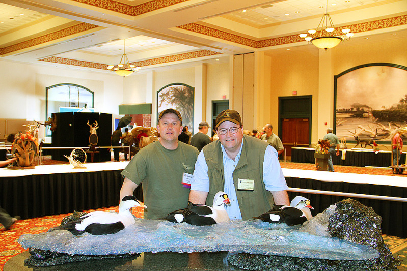 The center bird is a Redhead-Canvasback hybrid. Here's a Pacific and two King Eiders done for a coffee table style mount. Jerry Froelich on the left, Capt Charlie Summerville on the right. The detail in this mount in outstanding.