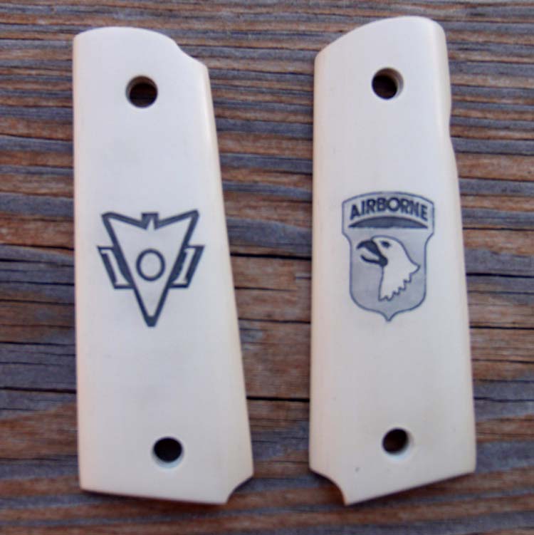 I just got my imitation ivory grips back yesterday, had the laser guy put the 101st patch on the right grip and the Recondo patch on the left grip. I got those grips at the show for a test bed. They look pretty good, now to the store for some India Ink. If it works out, I will try a set of white bone grips on my long slide and the CCW-LDA.