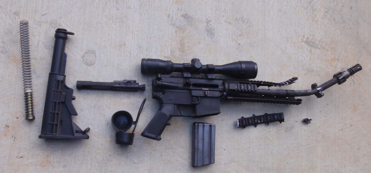 Everyone including me had a question in the back of their mind about the New Frontier polymer lower for an AR. Well on Saturday morning I got my answer. I was mowing grass on the farm, using the throttle lever, which I normally do not use. I hat two holes which threw the AR out of the rack on the right rear fender. The rear wheel missed the rifle as it hit the ground but the 6 ft Bush Hog did not miss. Starting at the top, the scope tube was bent, upper receiver was fractured, forend shattered, gas tube wrapped around barrel, gas block spun up, barrel bent in 3 directions, quick connect for suppressor destroyed, butt stock ripped out of the lower, stock key bent, rear take down pin sheared, buffer plunger and spring gone, pin plunger and spring gone, mag ripped from lower. The bolt and carrier survived. On Sunday after flushing and washing everything with mineral spirits, I went to the gun show we were having in town. I bought a pin, two plungers and two springs. Plus a new upper. I straightened out the stock key installed the rear pin, springs and plungers, screwed the stock back on the lower and locked it up with the wrench and ring nut. Put the new upper on the lower with old buffer, spring, carrier and bolt, stuck the old magazine in and the gun functioned like nothing had happened. The new upper is tight and the lower does not even have a change to the trigger pull. That is one tough lower. Here is what it looked like Saturday and looks like today. The pictures tell the story. In three years as an armorer in the 101st I never saw an M-16 this beat up, not even close. That lower was not hurt! Ed