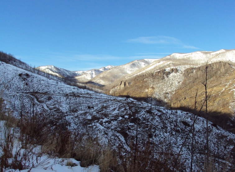 Now here I go, a guy that’s got 10,000 acres to himself, seeing over 1000 deer a day, some elk and I’m going to head to public land where no one would be stupid enough to go. I assure you, it was the snow capped peaks that were calling me. Thar’s snow and elk in those hills and I’m going after them, on my own. Because Bill had this lease, it was the only place he could outfit or guide, so having the tag I had and the freedom, I chose to just break up the day and put on some miles. That 3rd day I started the hike up a draw of snow with many drainages. The terrain was a nasty vertical, burn that I knew I would find elk, the deeper I went in. Snow was only 4-6” deep at this point. About 2 hrs into my hike I spotted an elk in the farthest hole of this mountain, so obviously I need to go investigate and see if there are more. An hour later I’m able to spot into the hole a little better and I run into a nice bunch of tracks about 20 head of elk in the snow. Of course they go up, so I go up and up. I would hit drifts of snow and go into my rear-deep of it. Meanwhile, still heading up and out of the burn and into a nice open park. The tracks led into heavy timber and I’m thinking this is the spot I want to stay until dark, to catch these elk coming out to grab a bite. Now to this point, I figured I put on about 8-9 miles on foot in snow ranging from 4” to 3 feet. It wasn’t the easiest of travelling to say the least.
