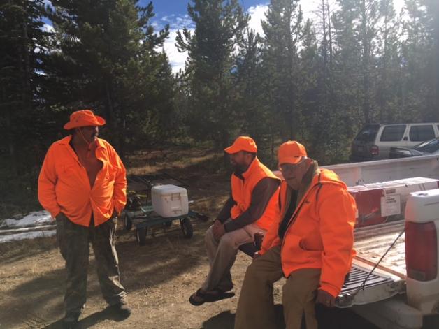 Description is. 3 guys are left to right Paul, Tony and yours truly....son decided to be photographer..........meadow where bull slowly appeared on far edge....walking left to right....was too dark to get accurate point count......turned to face us behind the two trees between and some how went back in trees....never saw him again....