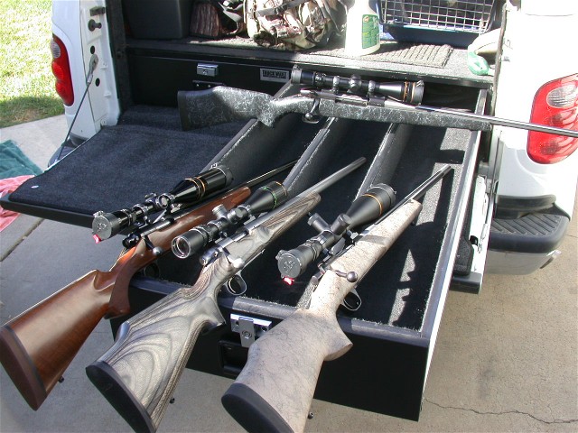 The rifle laying crossways is my Weatherby Mark V Accumark chambered in 7mm STW. Only difference is now it sports a Leupold VX-III 4.5-14x40 Long Range scope. I'm lovin' that round and it's a great shooter! Currently I'm shooting a custom made cartridge made by a firm out here in California that builds with blended powders. It's pushing a Barnes XLC bullet at about 3400 fps and my "point blank range" is about 395 yards if I recall correctly. I'm in the process of handloading the Nosler Accubond for it now but haven't shot or chronied any of the numerous test loads.