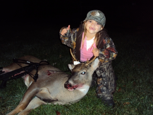 Well 4th time out seems to be the charm here. My 8 yr old boy killed his buck on his 4th time out this year and last night my 6 yr old daughter connected on her first buck ever after 4 days of hunting. I just got back from and Idaho trip where I killed a bull elk, so the woods was left alone for about 2 weeks. After checking the trail camera on the way in, I knew we'd be seeing some action that night. We sat for about an hour and I told her to get ready because in 10 minutes the bucks would be cruising. Not 5 minutes later I hear a dear coming. The buck was about 40 yards when we spotted him, so I fired up the video camera and hit my grunt tube a few times. He came in on a string and she closed the deal on this nice little 6 point with a 23 yard shot. The buck ran 30 yards and fell over. Her reaction on video was priceless. I'll edit the video and get it posted here. She sure made dad proud and now we have another hunter in the family. Now that both youngsters are tagged out, dad can start hunting during the final and best week of bow season. Needless to say it's been a good week...a bull elk and a first whitetail taken by my 6 yr old daughter! I'll post about my Idaho adventure soon.