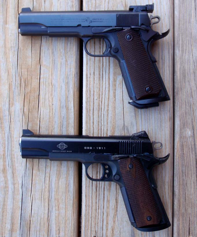 This is what it looks like finished, after polishing down the pin on the slide release to .090 so it would fit and function, replacing the aluminum safety, replacing the guide rod and bushing, rear and front sight with STI sights, replacing the main spring housing with a S & A, replacing the sear, changing it to a series 70 from an 80 (removing 5 parts), inserting a .060 spacer, replacing the firing pin with a hand made strong pin and setting the trigger to stop its wobble in the slot. Of course one of the things that did not fit were the dovetail slots which I had to recut by hand to fit the Novak bases of the STI sights. The bright spot on the 1911 (top gun) is just a light reflection. He liked the original GI trigger and its pull length. The 1911 has a 3.75 pound trigger and the GSG has a 4 pound trigger. The original GSG firing pin shattered at the thin legs while dry firing it on an empty case, it was so hard it had crystals in the metal. Ed