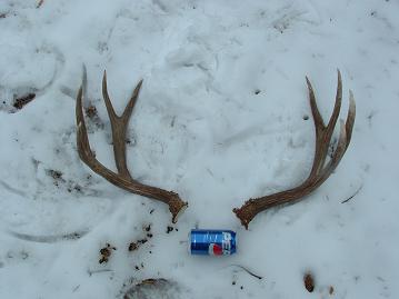 I found my fist one on jan 5, then no more till jan 25.but i was still seing bucks with antlers till about feb 25.those sheds in that last pic score 187 he was at least 25" wide,and the circumfrence at the bases is 6 and half. have you been shed hunting long?got any pics?heres another pairfound in march,scores 179