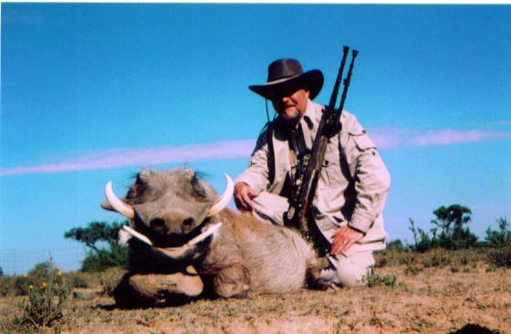 July 20th. We started our day after first light, again searching for Kudu. We spotted a good Gray Duiker but those little speed demons would cut me no slack. Off into the bush, not to be seen again. We glassed the deep kloofs and ridges all morning but didn't see but one large bull Kudu and he was a long way off and heading into the bush. Too far to follow. I saw a number of Impala, young Warthog's, Ostrich, Zebra, Hartebeast and the like, but no large Cape Kudu bulls. We decided to go look for Blesbok out on the plains and maybe come back that afternoon if we found any worth pursuing. We saw several herds of Blesbok, Springbok and Wildebeast. One lone Blesbok ram looked very good, but he didn't give me much time to study him before he ran off across the plains. We found a suitable area that had some sparse cover, so we decided we would come back after lunch and set up a possible ambush point. We found a nice shady area on top of a ridge and ate our lunch in the noon time breeze. It can get fairly windy during this time of year so take that into consideration when sighting in your guns for longer ranges. You may need to estimate windage from time to time. After eating our lunch, we discussed our plans for the afternoon and my PH really wanted to take a little time and search for a good Warthog. Boars had been scarce all week, but with the Sun warming up the ridges, Meyrick told me this would be a great time to look for them. We headed out driving the top of a long high ridge and found a place to scan the surrounding area. It didn't take him but a minute to find a BIG hog. I took a look through his spotting scope and it looked like a hog with two cavalry sabers sticking out of his mouth. This hog was grazing on top of a ridge in a clearing, all by himself. We decided to approach the area on foot, not wanting to spook other game by vehicle, so we left Jackson (my tracker) with the truck and off we went. We closed what I guess was several thousand yards without incident. Stopping on occasion to glass the flat to insure the hog was still there. When we got to within 250 yards, a lone Hartebeast that had been hidden by the bush, trotted out onto the flat and spooked the Warthog. He wasted no time in running off into the bush. With all hope of getting a shot gone, my PH yelled for Jackson to bring the truck. He called out several times and waived his arms, feeling sure that Jackson would be observing us through his binoculars. When Jackson didn't come, Meyrick started back up the ridge for him. About this time I spotted another hog entering the flat from our left. I turned to tell Meyrick and saw Jackson walking towards us, pointing. He had already seen several hogs making their way onto the flat. Evidently, the big hog didn't like company. And with his exit, the other hogs grabbed their opportunity to feed. Meyrick found one nice boar so we began our stalk. We made our way to within 110 yards of the boar and set up the shooting sticks. I was pondering in my mind where to hold on the hog as previously mentioning; my point of impact with my .280 was 200 yards, and I had already missed two Kudu at longer ranges. The hog turned broadside and raised his head in suspicion. I lined up a little low behind his shoulder and fired. "You shot over his back" Meyrick said with disappointment on his face. As the hog spun around and took off running like a Greyhound, I racked another round into the chamber and said; "Let me..." Meyrick cut off my sentence with: "If you think you can hit him..." Bam! At the recoil of my .280 the hog rolled in the dust. I caught him behind the right shoulder. The Accubond gave complete penetration and exited behind the left shoulder, killing him instantly. Not even a squeal out of the pig. "Nice shot" Meyrick said. "I'm going to have you shoot everything running from now on." He was kidding of course but I generally do better on running game if I shoot by instinct as opposed to studying the shot. Range was 125 yards. No feat by any means, just my lucky day. For some reason, I was very proud of taking that hog. Years ago I had been a guide for wild boar hunts. I had 300 clients take a pig with me and I have never killed any type of hog. This was my first pig; and I was thrilled! Nice tusks, with a little brooming on one side. Character, I think they call it on TV nowadays. Just a cool looking critter to me! Continued.....