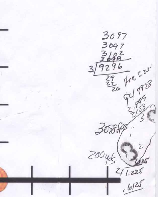 The three shots strung about 4" vertically @ 200 yds. No chrono readings. Dead battery