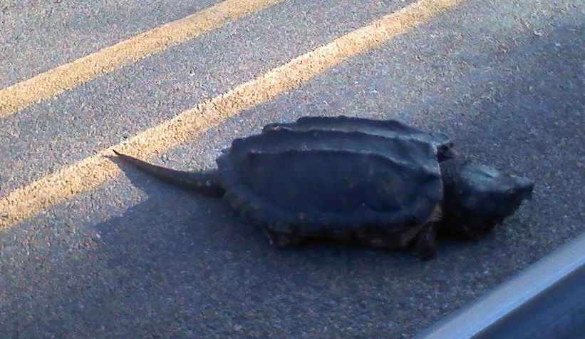 took this picture from my vehicle going home yesterday. This guys head was bigger than my fist. He just sat there while I snapped a couple of photos and talked to him, but I did give him the right of way on the road.