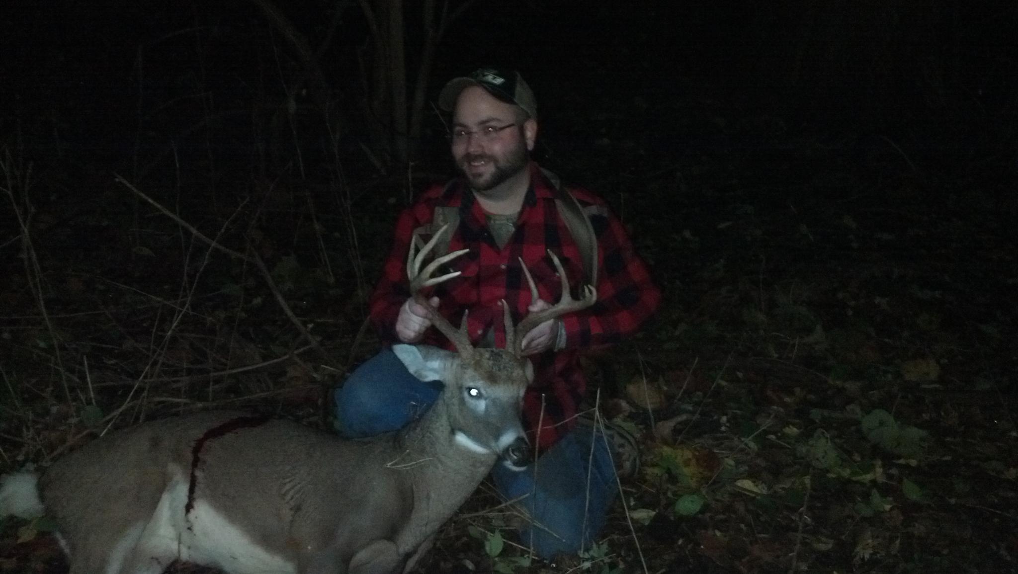 after a rediculous last year the folks in charge of returning good Karma shining on me, i got a doe in the early season, a doe with the ML (which i gave to a friend in need) and then wenesday out walks horns with five minutes of light left i could see he was a 6pt at min, i was pretty sure i missed him because he flinched after the shot and just walked away fast. well beside myself and on the edge of tears at my first buck oppurtunity in a few years me and my friends found blood. 80yds later we found my 6pt...EXCEPT HE HAD TEN COUNTABLE POINTS! he's no beast but a 10 point is something i thought i would only see in magazines and tv. i believe the new bow is so whisper quiet and the hellrazor broadhead and piledriver arrow whiffed him so fast he never realized anything beyond that he was scared so he chose to leave the scene. this deer re-affirms my belief that you need an exit hole with out it my entrance was so high i wouldnt have had any trail. tagged out is a new feeling before rifle season for me.