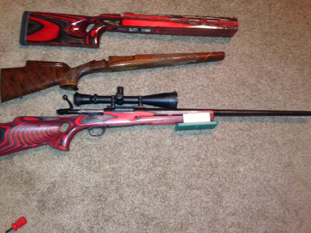 Received Richards Microfit thumbhole benchrest stock after 16 weeks. 3" forearm. Lots of sanding and finishing for final match. 16 coats of tru oil on it. Recoil lug bedded. Could use a little more work on finish of stock. Shot in high teens, low twenties with this stock. Weighs around 15 with this stock and scope. Tracks real well on front rest, recoil very light, you can watch your bullets hit from 850 to 1000. - Stock cost was $230 shipped, $50 recoil pad plus all my blood sweat and tears to get it to look and feel the way it does.