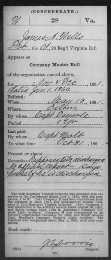 On my mother's side I only have documentation on one of the 3 brothers that served. He was James Allen Wells. ( my 3rd great grandfather)He was wounded at Phillippi in 1861 and he had to get a leg amputated.