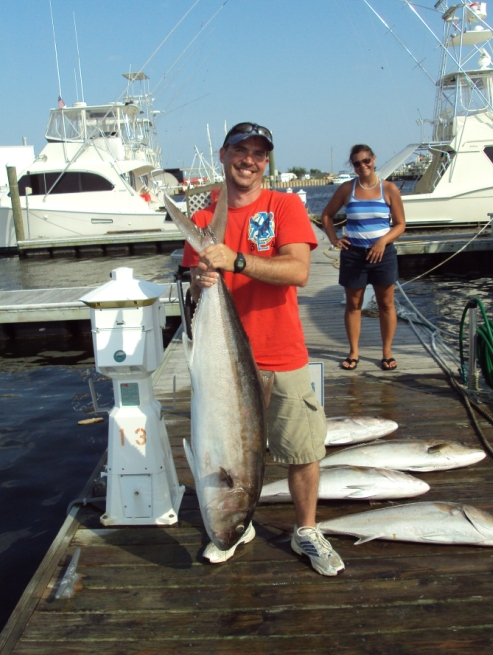Went out with Hoodini Charters here in the OBX this week, while on vacation. Hooked up on a 42 lb amberjack. They sure are a fighting fish. The main target was billfishing, maybe a dolphin or wahoo. This was a stop along the way at a navy tower in the water. We each got our amberjack (party of 5) in about 30 mins total. Good thing we stopped here. 40 miles of trolling in 8 hrs and not a single billfish strike. Just one 12' hammerhead hit our teaser and a wahoo strike that didn't hook up. It was a good day though...that's fishing. Came back with 153lb of fish, 45 lbs of meat. Local shops were selling it for $12.99/lb so not a bad day.