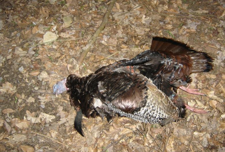 Not my biggest but a solid 3 possibly 4 year old. I've had several opportunities at jakes and bearded hens last week, plus I've been running into so many other hunters in the woods. Story... I didn't get to hunt Monday, but yesterday I headed for some compnay ground behind gated roads to get away from all the other hunters. After getting where I wanted to be and waiting 30 mins right at daylight here comes a couple guys stomping down our gated "KEEP OUT" road. That made me mad, so this morning I picked a spot I haven't been to this year but is one of my old honey holes. It does get the pressure, but I figured mid-week and if I get in there early, I'll have it to myself. I got to where I wanted to be by 5:00 am, no other vehicles. Perfect. I have about 500 yards to walk and I take it slow, watching for dark objects in the trees. About 5:30 I'm all set up and I hear a vehicle coming down the road towards my truck..."just great" I think to myself. Thankfully the person had enough respect once he saw my truck he turned and left. About 10 till 6 a bird gobbles not more than 80-100 yards from me. From hunting this area over the years, I know exactly where he's roosted and probably what he's going to do. He's off a ridgeline and he should just pitch onto the bench I'm sitting on and come right on over right?? ha ha. Well knowing that this bird has been pressured, I only give him a couple clucks and one small series of tree yelps just to let him know where I am. He flys out EARLY compared to any other bird I've been hunting this year. The next time I hear him gobble he's 200 yards away on the ground, heading away from me. Man that sucker flew down the hill...I'm thinking maybe I shouldn't have even called to him in the tree at all. (Figuring everyone else has probably been hammering him in the tree) I start clling and the next time he gobbles, he's almost out of hearing distance.."He's heading away!!" I jump up and run down to where he was roosted and call. He gobbles about 150 yards away. I have about 20 more yards to get to the edge of the hill so I can see down over and I need to get there quick...I get about 5 yards to the edge easing my way down and I hear him spit and drum. "Man He's close, gotta be about 50 yards away I think to myself. I can hear him as he goes into strut, but I can't see him. Finally I pinpoint the sound and the next time he goes into strut I can see the top of his tail feathers. "Is he in range?" I think.. I give him a couple clucks and he gobbles and goes into strut. "Man he's close, yup he's in range" That time I saw the top of his fan right beside a tree at about 40 yards. Thats about the end of my rope, or as far as I like to shoot them, even though my gun will do better. I need about 1 foot of height and I would be able to see him on the side of this hill. I figure I'll make him gobble once more, pop up and give him a breakfest of #6's. So I call once more he gobbles, up I pop...there he is head still out, right at 40 yards...BANG...that's all she wrote. Key notes on this hunt: Woodsmanship more so than calling helped me kill this high pressured, old bird. 1. Once I figured he was moving away I ran to the exact spot he was roosted. I often see hens running right to the tree gobblers are in before the pitch down. 2. The bird was hung up at this spot..had I stayed he would have never of come in. 3. The ridge line made it perfect for me to crawl into a spot that got me into gun range without being spotted. All in all, I'm satisfied. I had a tangle with this bird last season in the same spot and he won. A year later, I won the battle.