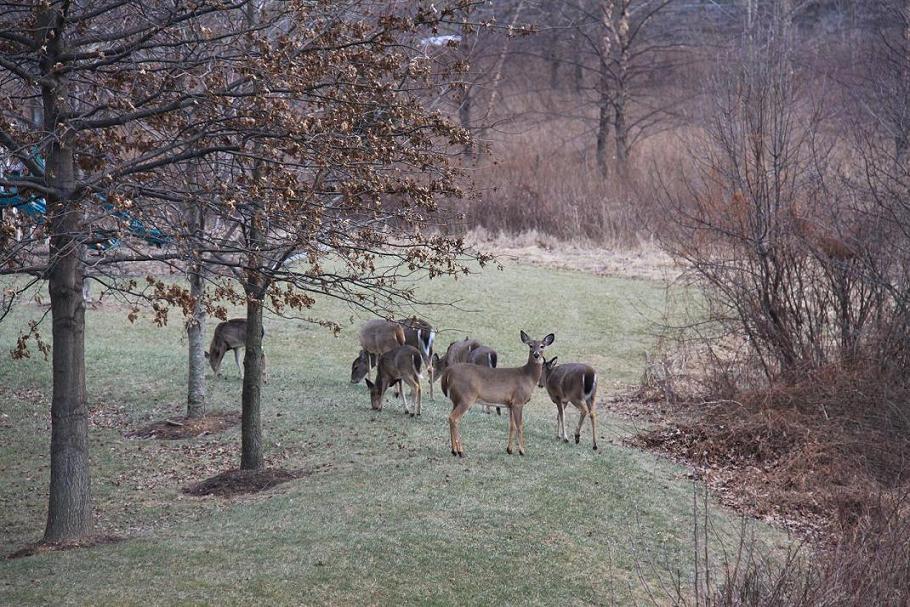 I can remember 20 years ago when I first started hunting deer. In Maryland, it was a buck or nothing at all. We were allowed to kill a single buck with a rifle or a bow. Wasn't into muzzleloader back then, if it even existed, so at most we got to kill 2 bucks. NO DOES at all. Now, in the county I live in and most of the surrounding counties, we have deer coming out the wazoo. I have counted 12 in a little 5 acre wetland behind my townhouse. The wetland area is part of a creek that runs for miles and miles that the deer stay in during the day. Here are some pics that I took behind out townhouse last January 15. The big buck had a weird rack.