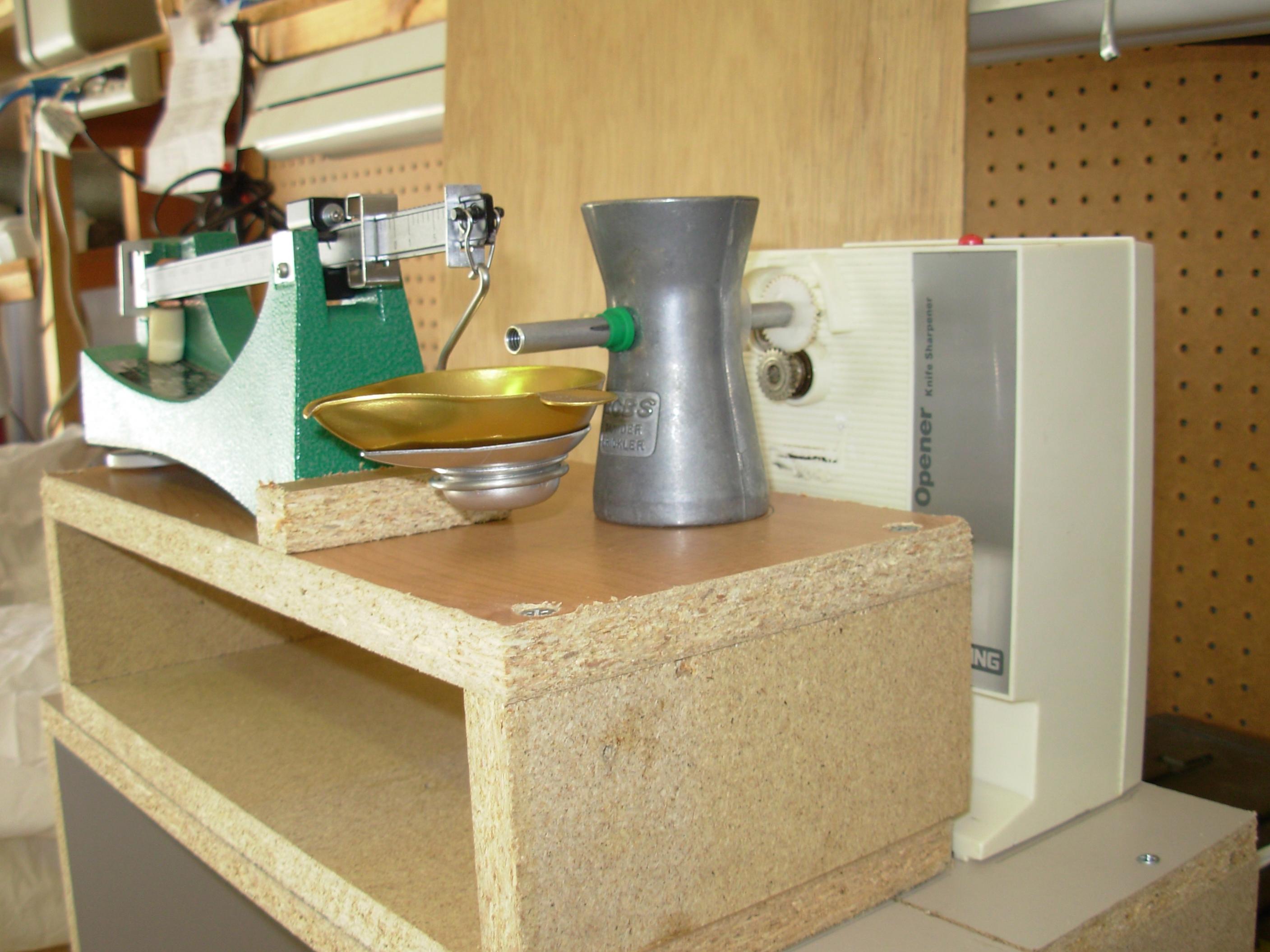I throw the charges slightly under desired weight into a pill container then transfer that onto the scale pan, then top it off with the trickler I have modified to trickle up with power from an old electric can opener. I can bump it up to drop many or just a single kernel. It is fast and the cost was like $5.00 for the can opener at Goodwill. I made a box for the whole thing to stand on so it's at eye level. (Can someone resize this picture for me?)