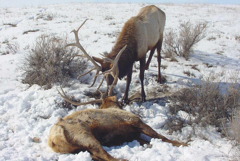 I thought you might be interested in these pictures. We received a call from Range Control at CFB Suffield about two bull elk with locked antlers. By the time we got there, one elk was dead. We guess they had been locked for at least 24 hours. They were caught solid, and obviously there was little