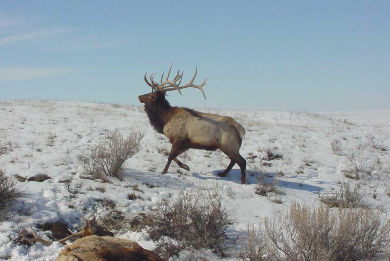 chance of the remaining elk freeing himself. After careful consideration, I was able to sneak in and cut an antler off the dead elk with a horn saw. This freed the bigger bull, and he considerately went backwards and ran off across the prairie instead of over top of me, for which I was thankful.