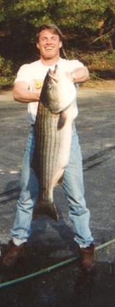 Anyway, back to my story. The first time I went Rockfishing was my second year in law school. The first fish we hooked up, I passed to my law school buddy and it was a 35" rockfish at around 20 pounds. I was cussing at myself because I had never seen a fish that big on a hook while fishing. Anyway, I got the next, and last, fish we hooked that day and it turned out to be a 42" Rockfish at 30 pounds. It took me about 20 minutes to reel it in and my forearms were on fire. Probably didn't help anything that I did an upper body workout the very night before. My friends were laughing at me until that fish's head broke the water. At that point, we were wondering how we were going to get it in the boat because the net wasn't big enough and we didn't have a gaf. My other law school buddy (i.e., the one that didn't reel in the other fish), being a charter boat mate out in the ocean for tuna, bill fish, and shark, leaned over the back of the boat and picked the fish up by the mouth with both hands.