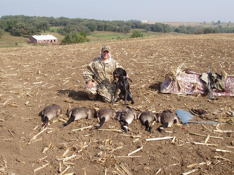 Here is a picture from early season goose here in Iowa. We had 6 geese down in about an hour and a half. My German shorthiar did just fine retrieving them to me. "who says you need a lab?" It was a lot of fun. I took some people who have never goose hunted before. We had the geese raining into our decoys and they loved it. We hunted about 35 west of Des Moines