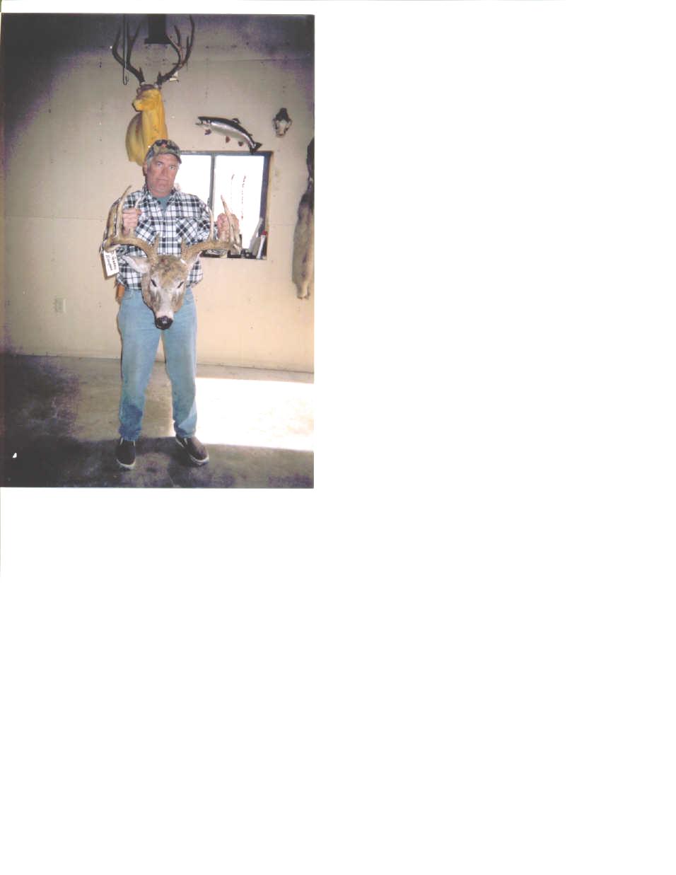 This is a picture of my uncle holding the rack from a whitetail our friend shot this year. I believe it was a 6x7. You just can't tell because of picture quality. The rack was huge. My uncle is a pretty good size guy and that rack was wider than he was. My uncle shot a 5x6 mulie that went 28 inches wide. I will post pics on the mulis forumwhen I get them from him.