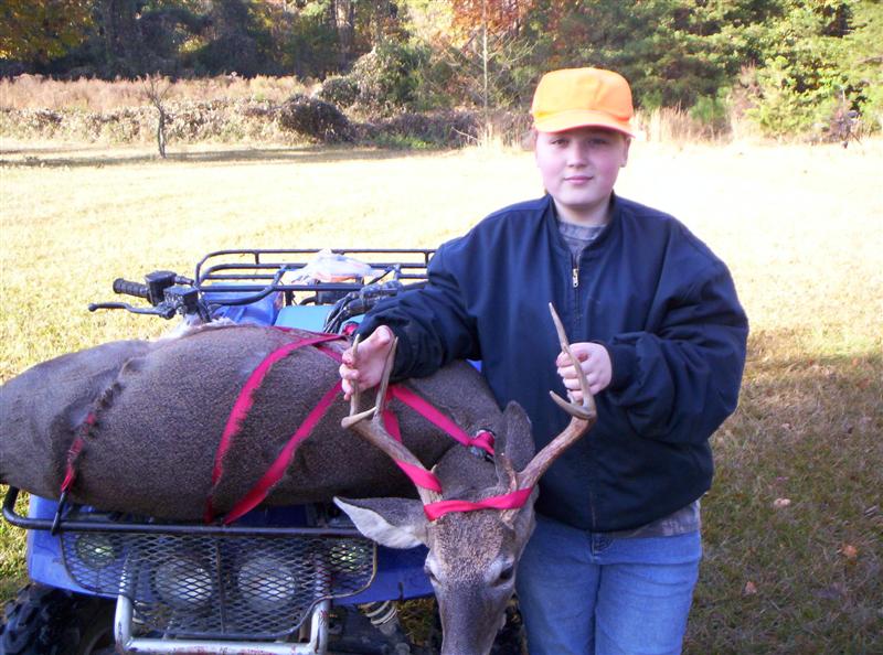 This is my daughter's first deer. Her name is Jessica, she is 12 and she has been hunting fer 3 years now. Her patients finally paid off fer her. She harvested a nice 9 pt. that weighed around 180 lbs. I was actually shakin more than she was, well until after she made the shot. This buck came out in a small clearing and gave her a perfect broadside shot at about 30 yrds. Needless to say I am very happy fer her. She picks on me now because my biggest buck is a 6 pt. All the pickin she will do will be well worth being there with her.