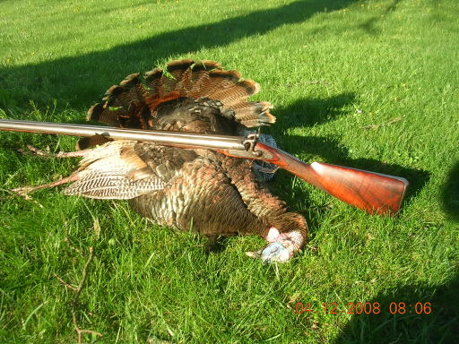 I took this jake on opening morning in Kentucky with an antique muzzleloading double barrel shotgun that I bought from a friend last summer. It has Damascus twist barrels, but is in really good condition. I took the turkey with a load of 70 gr. of FFg Goex Black Powder and an equal volume of #6 shot at 14 yards. The distance was fine, because beyond 25 yards the pattern is so open I knew I could never take such a shot. I had been looking forward to trying to take a turkey with this gun ever since I bought it. Normally, I would not shoot a jake, but I had decided that I just wanted to see if I could kill a turkey with this old gun and would shoot any legal bird. I was as happy as I have ever been with any bird I have ever killed!