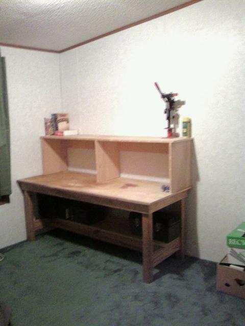 7 Years ago this Ash topped workbench was "thrown away" at a place I worked. I grabbed it and stored it at an in-laws for six years, then on my grandmothers front pourch for a year, and finally my wife (God Bless her!) gave me the go ahead to use the itty bitty tiny second guest room in our double wide for a "man cave" (Arh arh arhhh). Got the bench in place last night, and started wandering around the house picking up various gun related items and hauling them in. Round about trip #9 I realized that if I ever wanted a picture of this thing before it was hidden under piles of tools and parts I better snap it. So I whipped out the cell phone and took a REALLY bad quality snap shot of it.