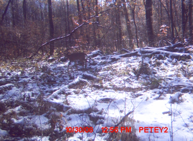I did bust a buck in the morning (I assumed it was one by where it was laying and how close it let me get to it). Scared the heck out of me when he blasted out of there not 10' from me in the pitch black. I figured he must of had a doe pretty tight or something. My assumptions were correct. When I was walking out I cut a nice buck track right on a doe track not 50 yards from where I jumped him. It was fresh in the snow and heading towards my stand. I probably left 15 minutes too early. I guess I'll find out if there's a picture of him on the camera about 9:45 on 10/29! ha ha