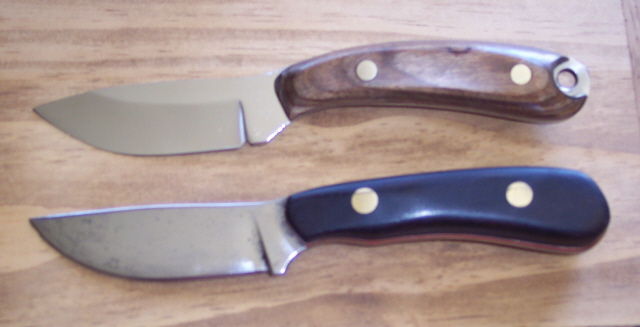 Lower one is one that I made 20 years ago It is made from an old planer blade I had from the saw mill ebony handle with red and white spacers and brass pins Upper one was carved out of a piece of 440 steel fashioned after the original with a few modifications walnut dymondwood scales with brass pins
